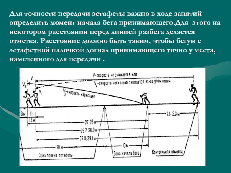 делается отметка. Расстояние должно быть таким, чтобы бегун с эстафетной палочкой догнал принимающего точно у места, намеченного для передачи .