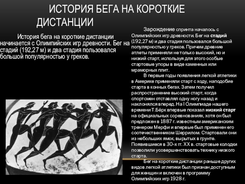 два стадия пользовался большой популярностью у греков.Зарождение спринта началось с Олимпийских игр древности. Бег на стадий (192,27 м) и два стадия пользовался большой популярностью у греков. Причем древние атлеты применяли не только высокий, но и низкий старт, используя для этого особые стартовые упоры в виде каменных или мраморных плит.