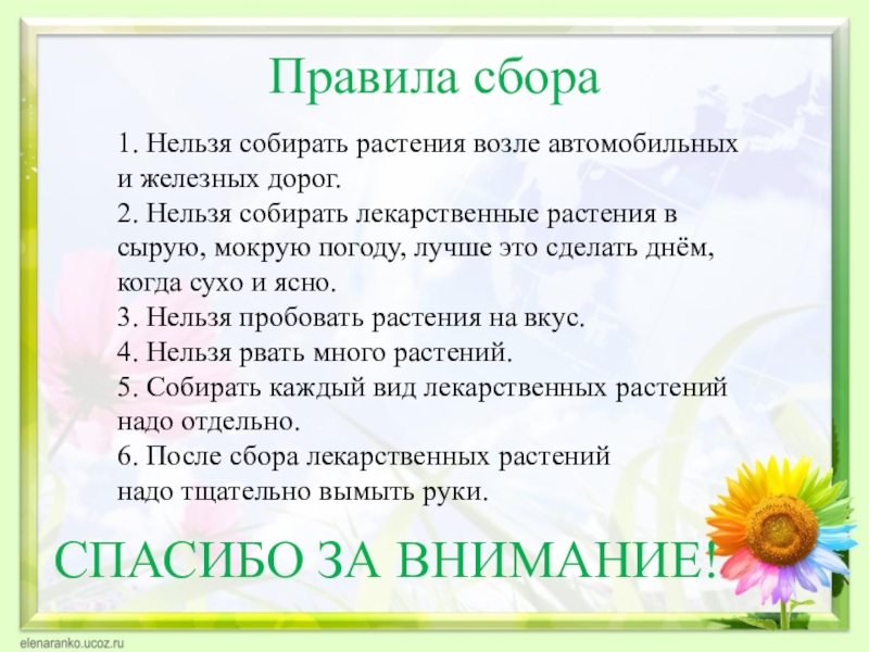 1. Нельзя собирать растения возле автомобильных и железных дорог.