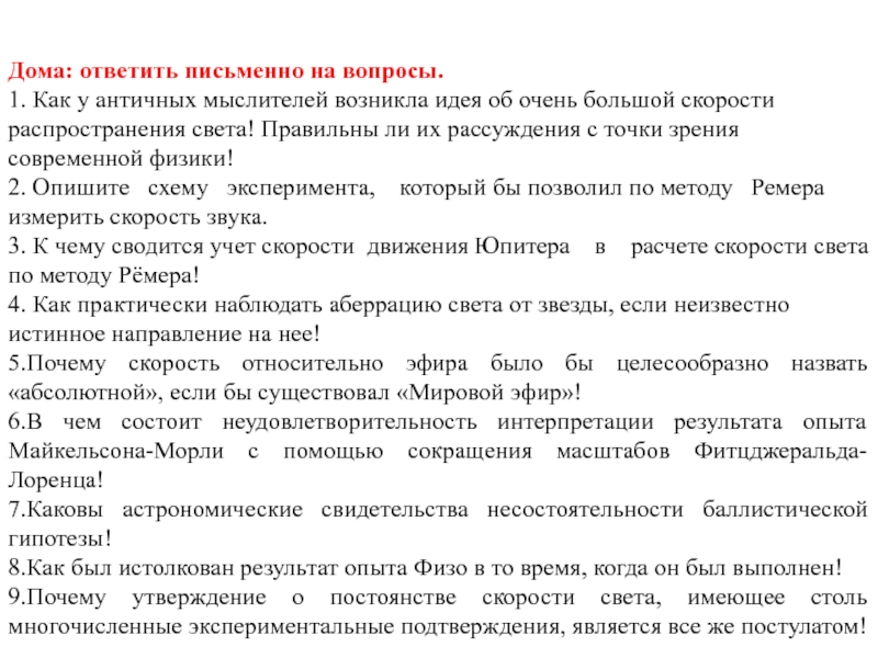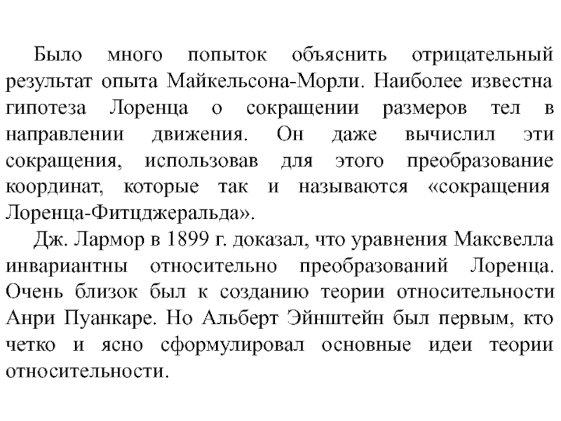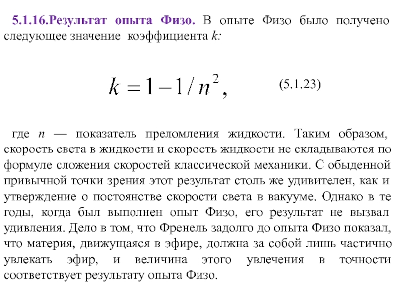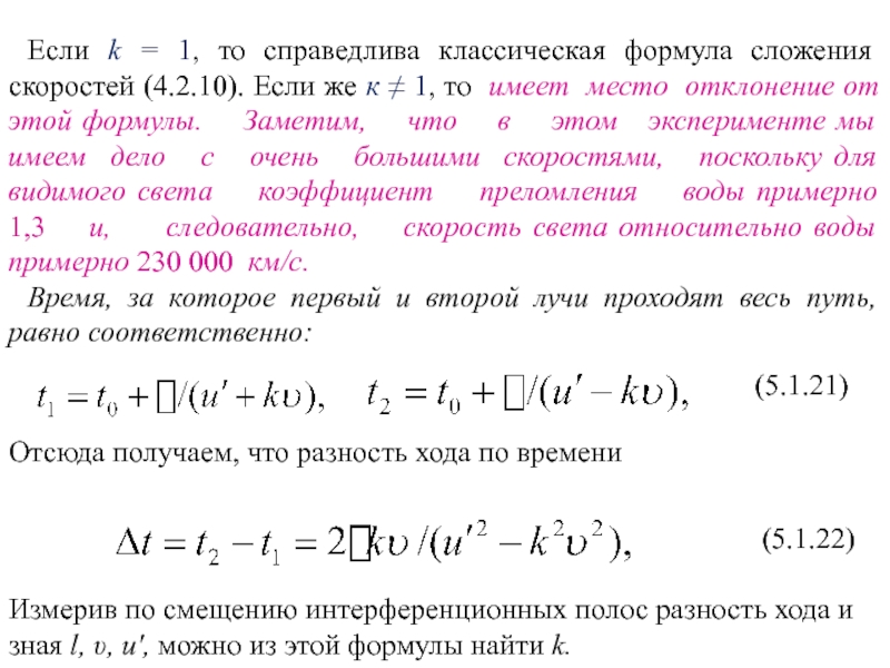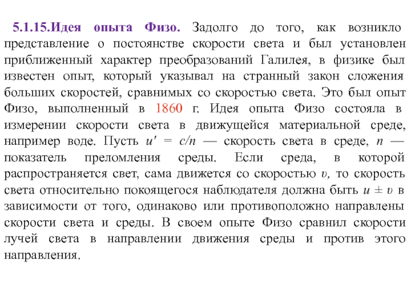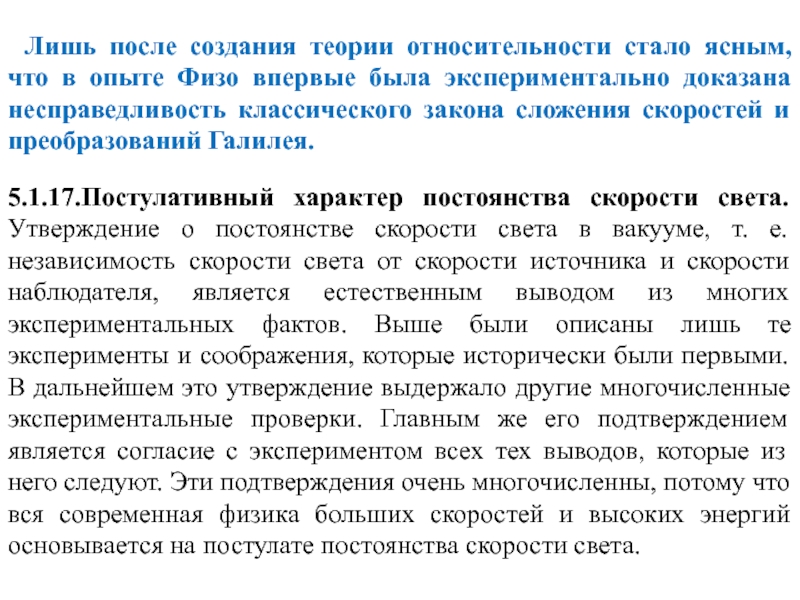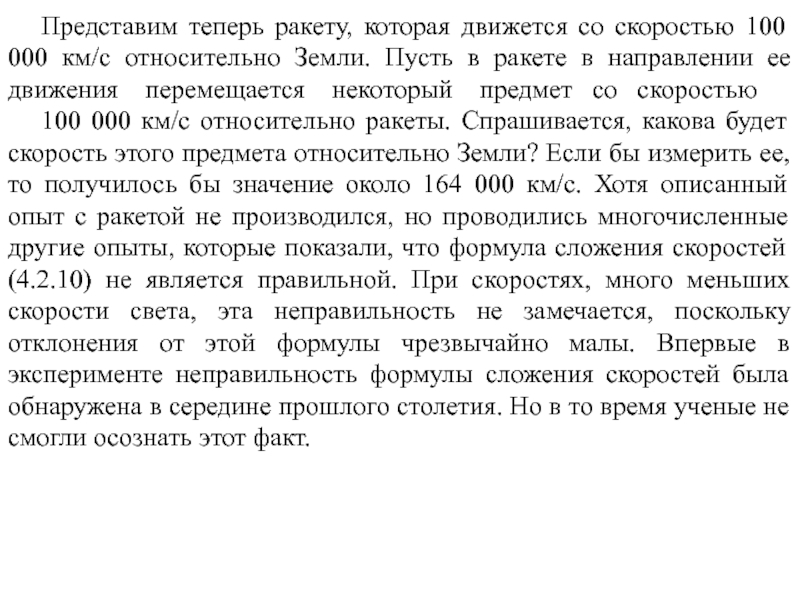 с формулами сложения скоростей (4.2.10), которые являются следствием преобразований Галилея. Таким образом, можно сказать, что преобразования Галилея (4.2.12) противоречат экспериментальному факту постоянства скорости света. Однако это противоречие становится заметным лишь для достаточно больших скоростей.Представим себе поезд, который движется со скоростью 100 км/ч относительно полотна железной дороги. Если вдоль вагона в направлении движения поезда идет человек со скоростью 5 км/ч относительно поезда, то скорость этого человека относительно полотна железной дороги равна 105 км/ч. Этот результат понятен и полностью согласуется с привычными представлениями о пространстве и времени, выражением которых в рассматриваемом случае является формула сложения скоростей классической механики. Эксперимент неоднократно подтверждал эту формулу.