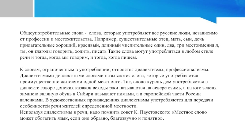 Используя диалектизмы в речи, надо помнить совет К. Паустовского: «Местное слово может обогатить язык, если оно образно, благозвучно и понятно».