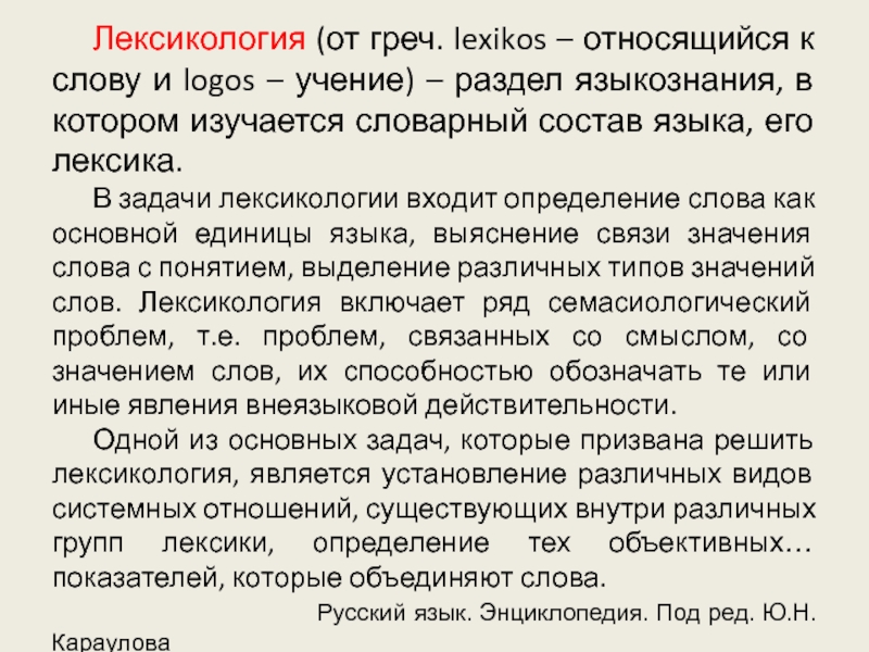 Слайд 4Лексикология (от греч. lexikos – относящийся к слову и logos