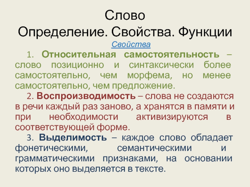 1. Относительная самостоятельность – слово позиционно и синтаксически