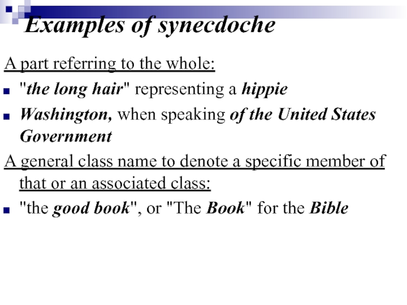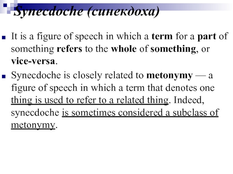 Synecdoche is closely related to metonymy — a figure of speech in which a term that denotes one thing is used to refer to a related thing. Indeed, synecdoche is sometimes considered a subclass of metonymy.