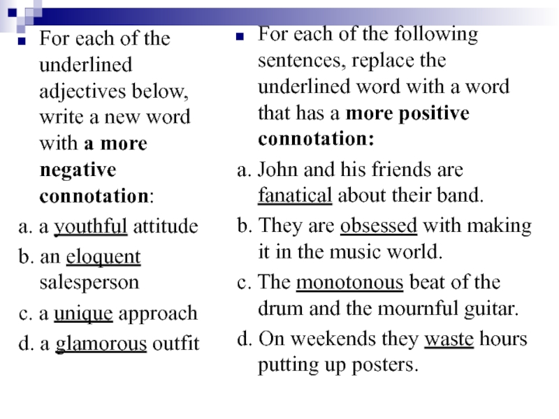 For each of the following sentences, replace the underlined word with a word that has a more positive connotation: