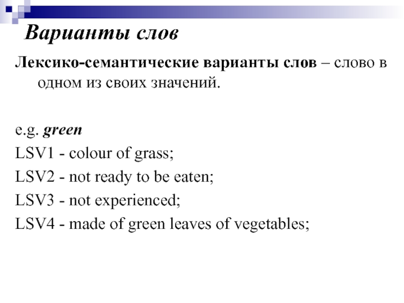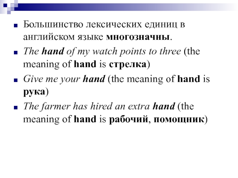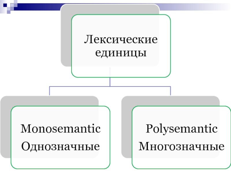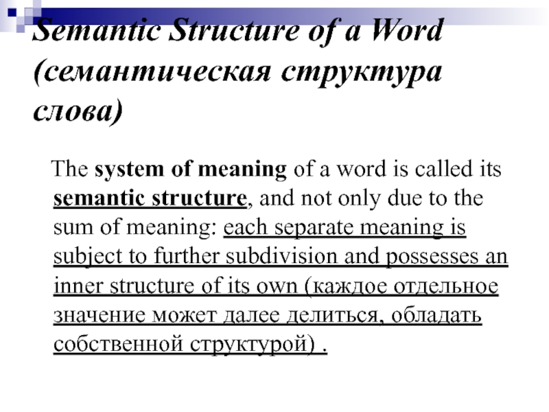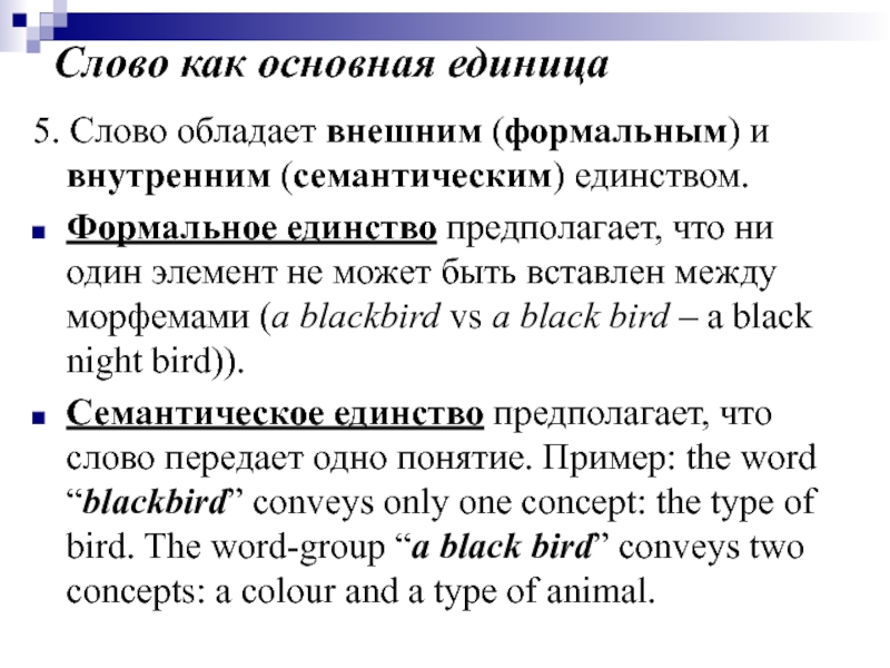 Семантическое единство предполагает, что слово передает одно понятие. Пример: the word “blackbird” conveys only one concept: the type of bird. The word-group “a black bird” conveys two concepts: a colour and a type of animal.
