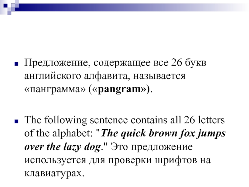Слайд 14Предложение, содержащее все 26 букв английского алфавита, называется «панграмма» («pangram»).
