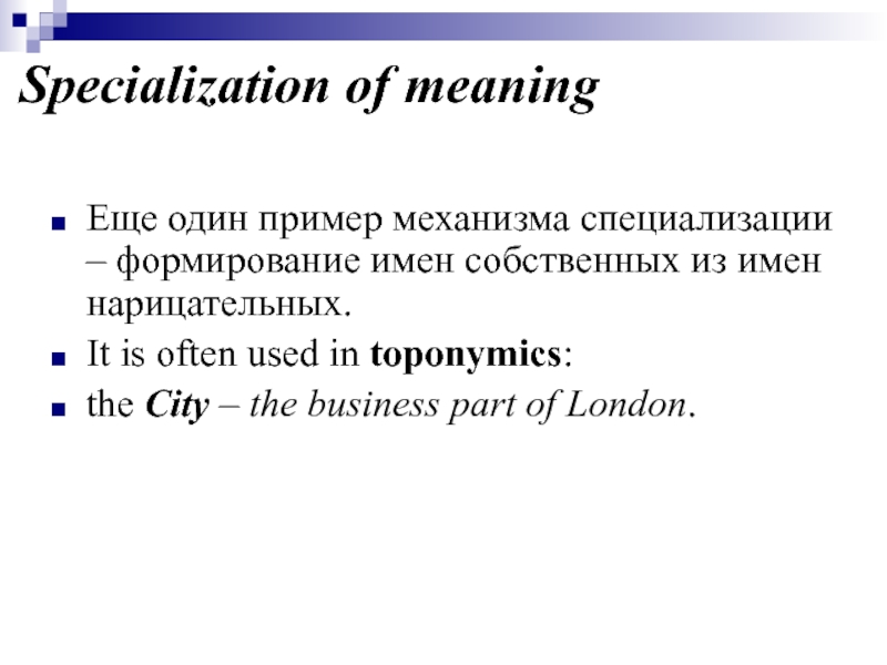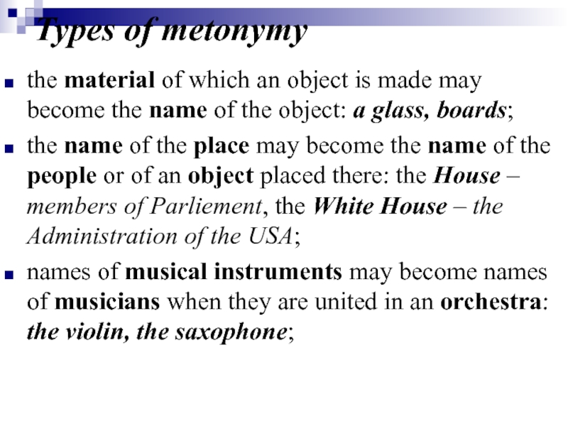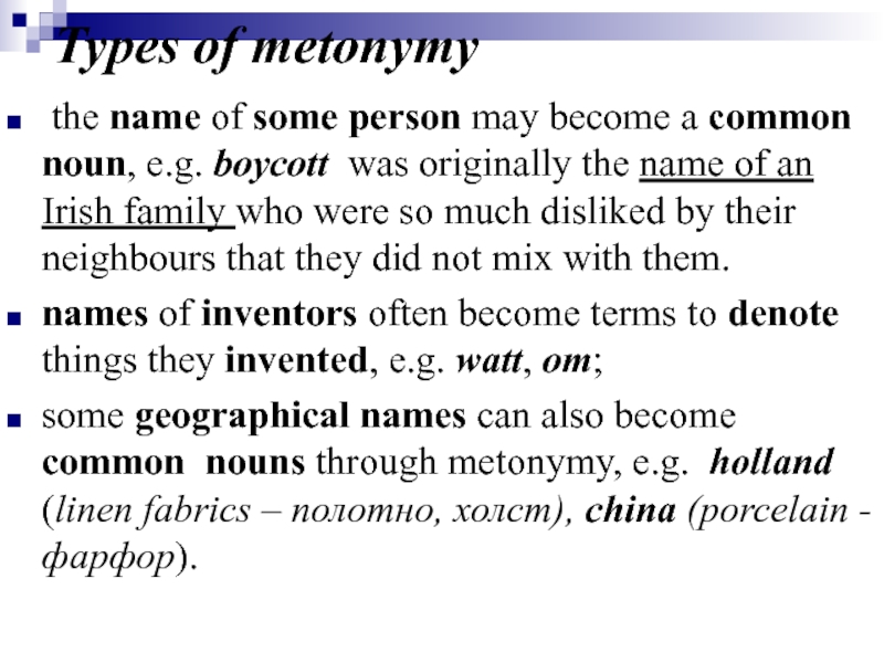 some geographical names can also become common nouns through metonymy, e.g. holland (linen fabrics – полотно, холст), china (porcelain - фарфор).