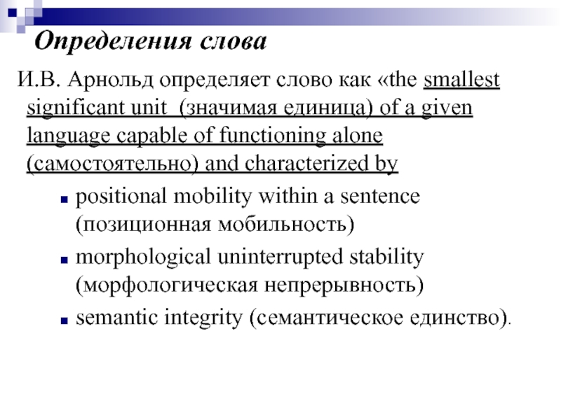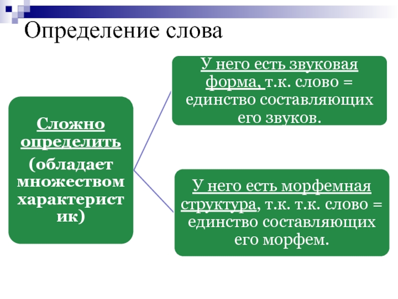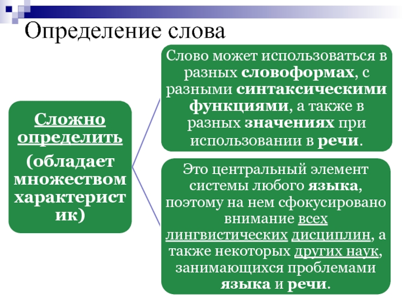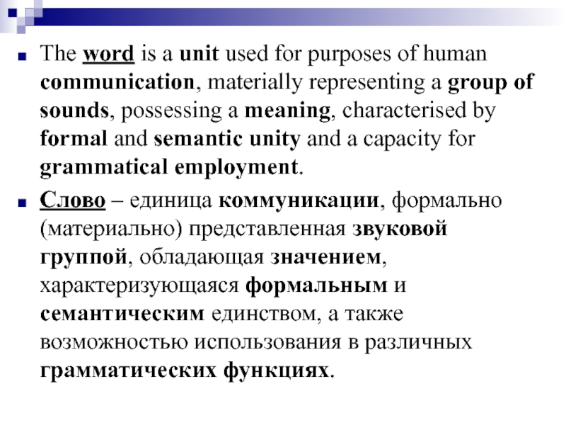 Слово – единица коммуникации, формально (материально) представленная звуковой группой, обладающая значением, характеризующаяся формальным и семантическим единством, а также возможностью использования в различных грамматических функциях.