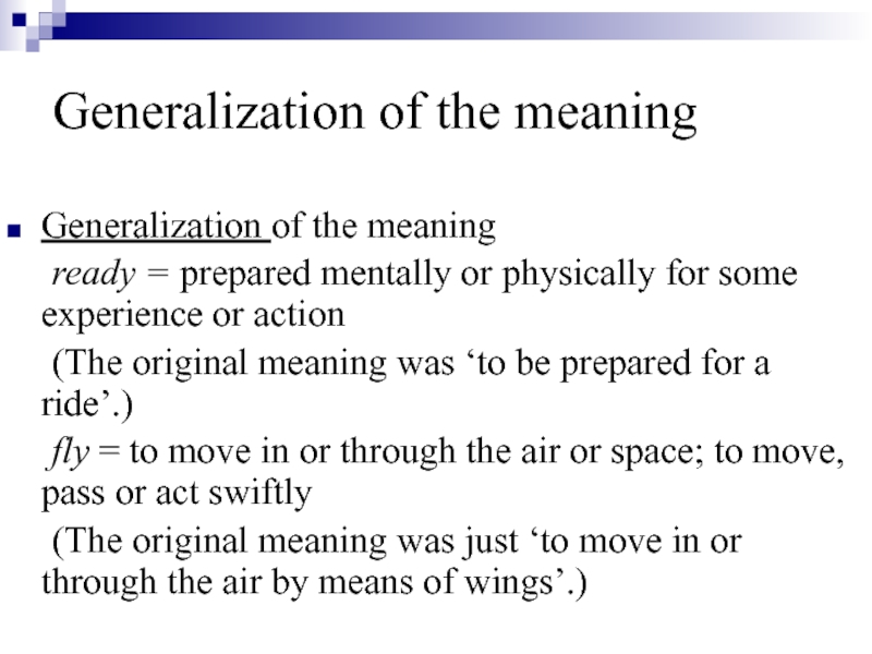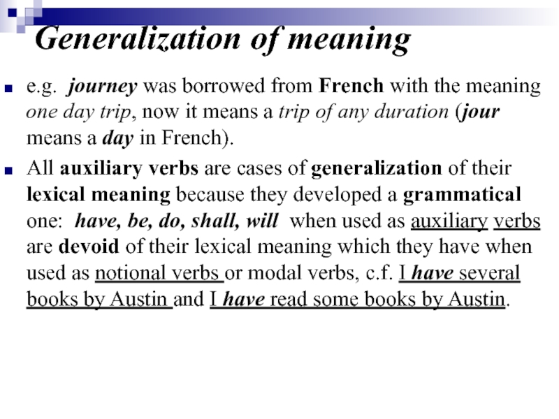 All auxiliary verbs are cases of generalization of their lexical meaning because they developed a grammatical one: have, be, do, shall, will when used as auxiliary verbs are devoid of their lexical meaning which they have when used as notional verbs or modal verbs, c.f. I have several books by Austin and I have read some books by Austin.