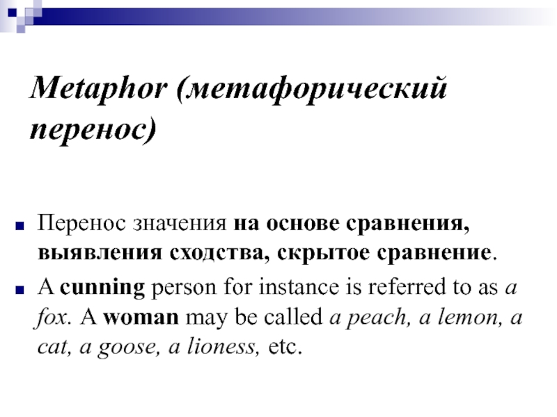 a fox. A woman may be called a peach, a lemon, a cat, a goose, a lioness, etc.
