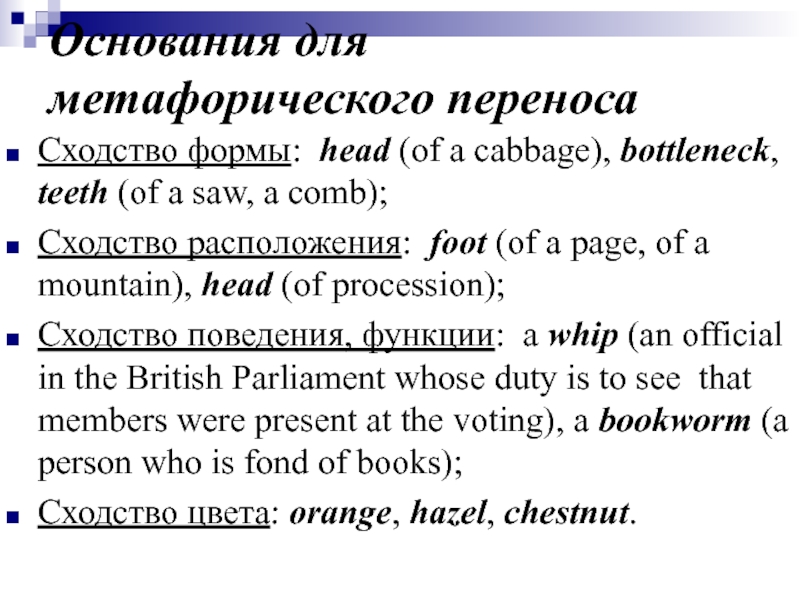 Сходство поведения, функции: a whip (an official in the British Parliament whose duty is to see that members were present at the voting), a bookworm (a person who is fond of books);