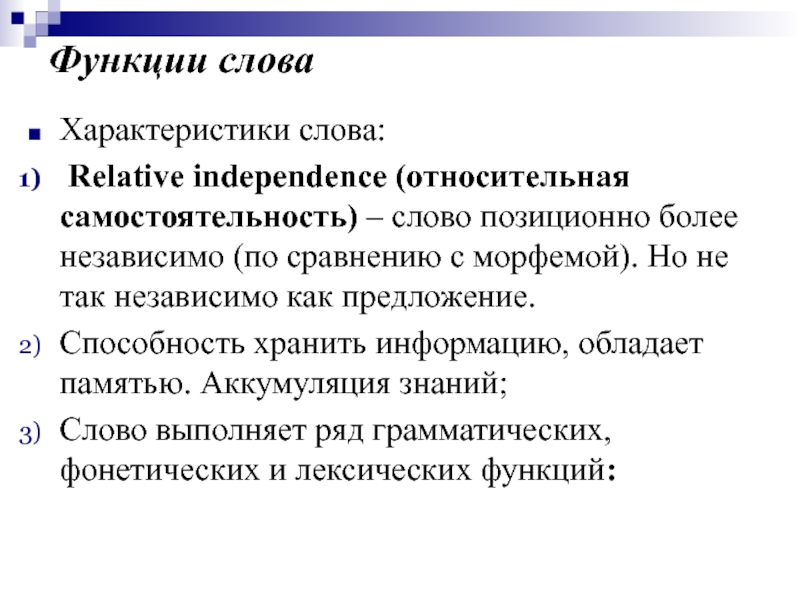Слово выполняет ряд грамматических, фонетических и лексических функций: