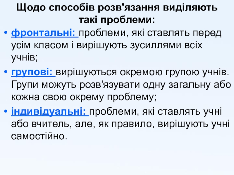 індивідуальні: проблеми, які ставлять учні або вчитель, але, як правило, вирішують учні самостійно.