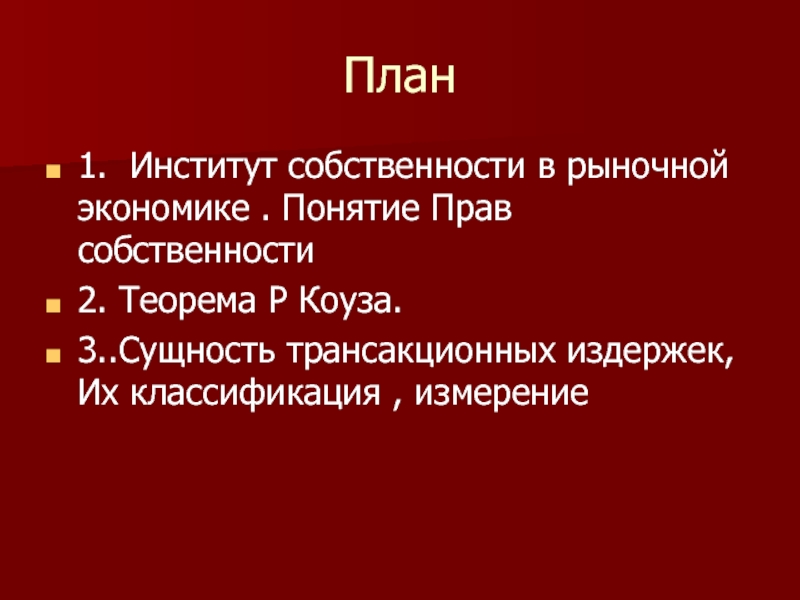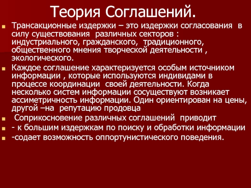 Пример с пастухом и земледельцем. Право на запрещение вредного использования земли является специфическим активом, обладание им создает стимулы для оппортунистического поведения( шантажа и манипулированием контагентом ) со стороны земледельца. Трансакционные затраты становятся высокими.