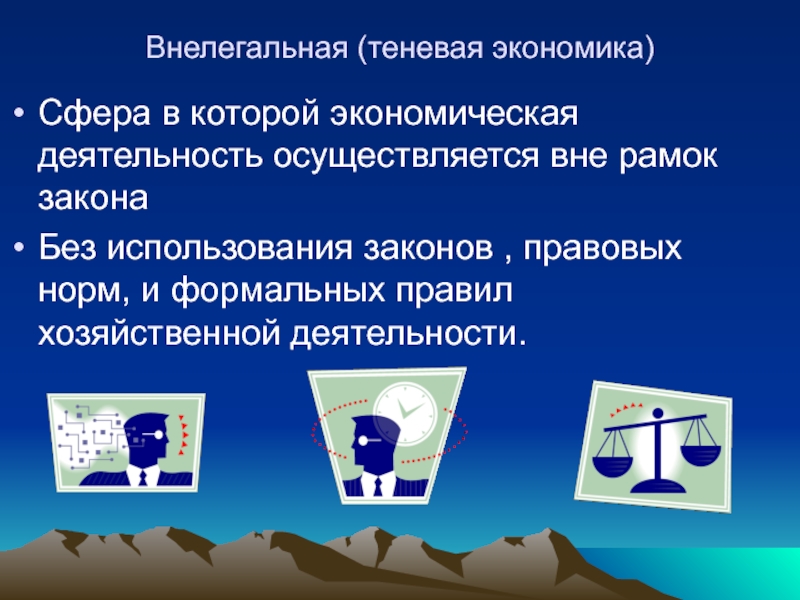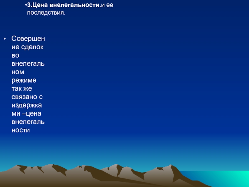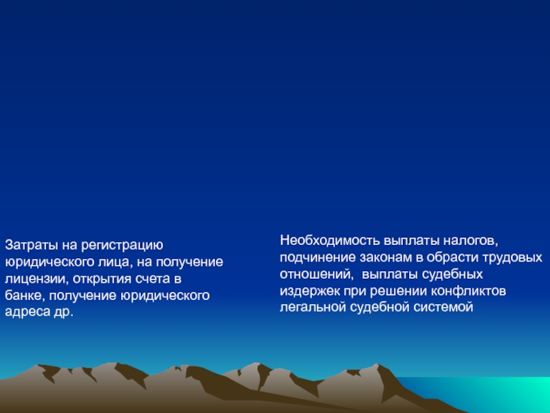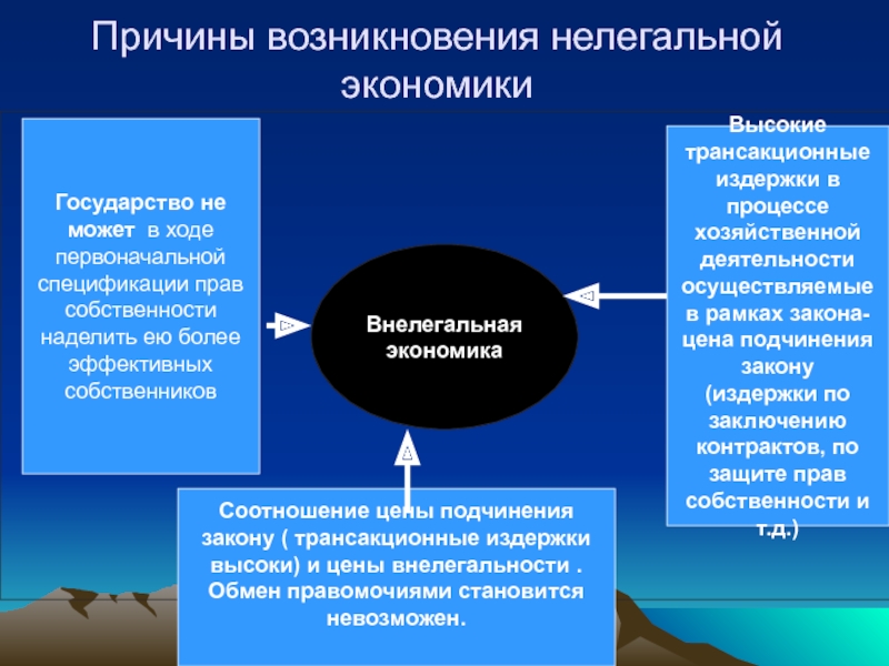 Соотношение цены подчинения закону ( трансакционные издержки высоки) и цены внелегальности .Обмен правомочиями становится невозможен.