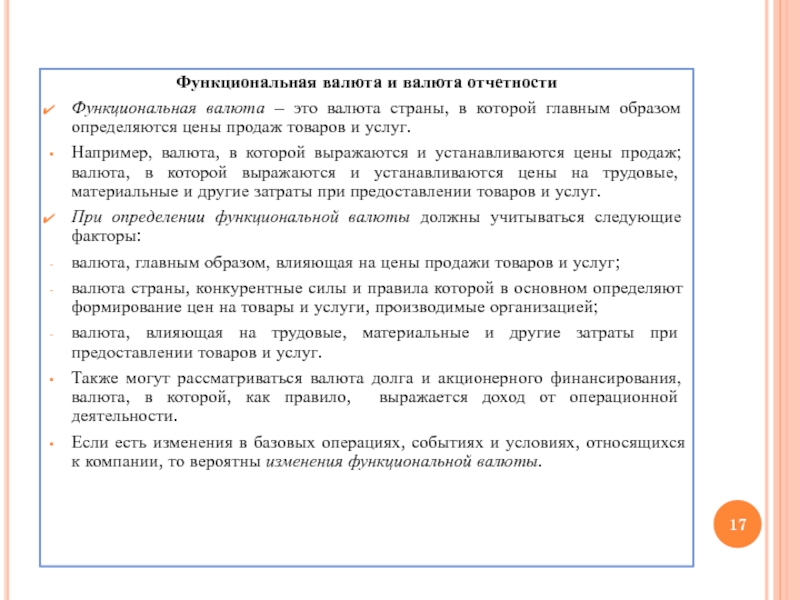При определении функциональной валюты зарубежной деятельности и целесообразности ее совмещения с функциональной валютой отчитывающейся компании нужно рассмотреть степень самостоятельности этого предприятия