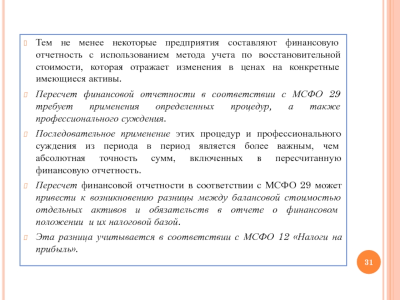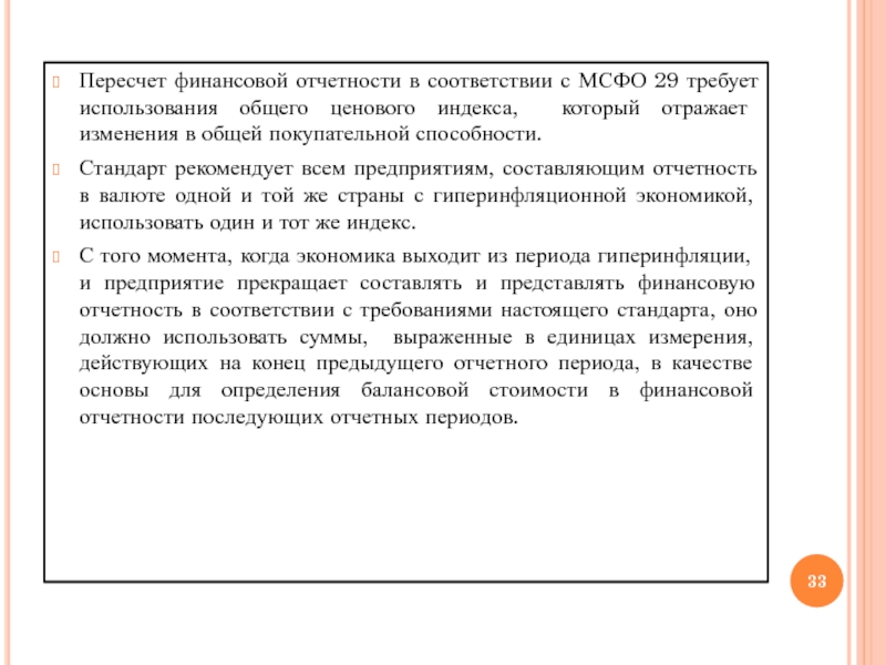 Слайд 33Пересчет финансовой отчетности в соответствии с МСФО 29 требует использования