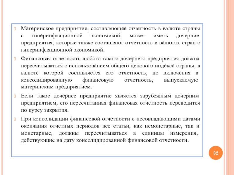 Слайд 32Материнское предприятие, составляющее отчетность в валюте страны с гиперинфляционной экономикой,