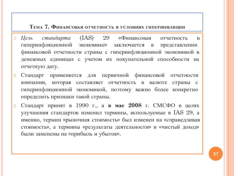 Слайд 27Тема 7. Финансовая отчетность в условиях гиперинфляции
