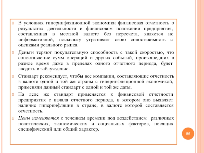 Слайд 29В условиях гиперинфляционной экономики финансовая отчетность о результатах деятельности и