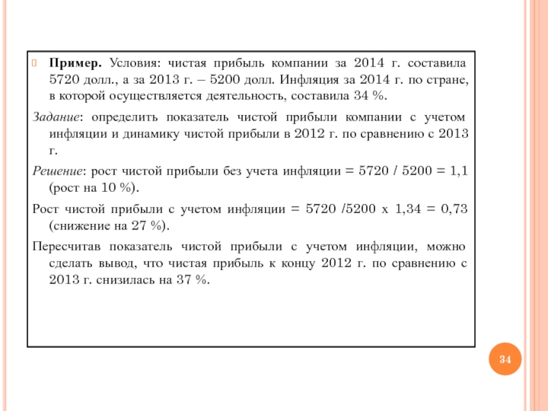 Рост чистой прибыли с учетом инфляции = 5720 /5200 х 1,34 = 0,73 (снижение на 27 %).