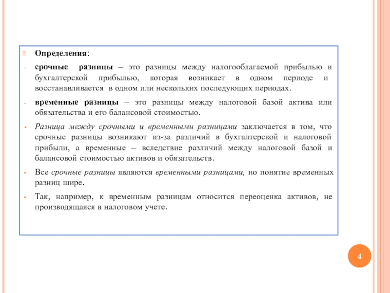 Разница между срочными и временными разницами заключается в том, что срочные разницы возникают из-за различий в бухгалтерской и налоговой прибыли, а временные – вследствие различий между налоговой базой и балансовой стоимостью активов и обязательств.