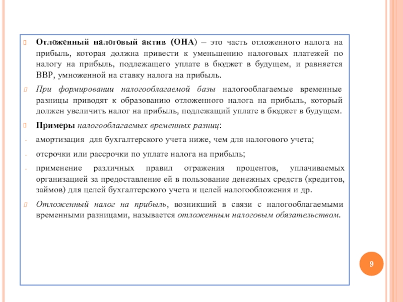 Слайд 9Отложенный налоговый актив (ОНА) – это часть отложенного налога на