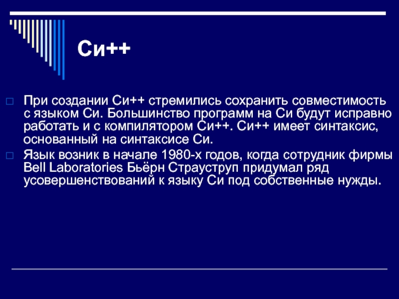 Язык возник в начале 1980-х годов, когда сотрудник фирмы Bell Laboratories Бьёрн Страуструп придумал ряд усовершенствований к языку Си под собственные нужды.