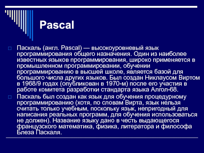 программировании, обучении программированию в высшей школе, является базой для большого числа других языков. Был создан Никлаусом Виртом в 1968/9 годах (опубликован в 1970-м) после его участия в работе комитета разработки стандарта языка Алгол-68.