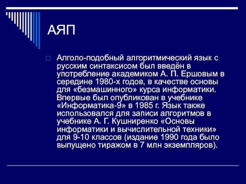 основы для «безмашинного» курса информатики. Впервые был опубликован в учебнике «Информатика-9» в 1985 г. Язык также использовался для записи алгоритмов в учебнике А. Г. Кушниренко «Основы информатики и вычислительной техники» для 9-10 классов (издание 1990 года было выпущено тиражом в 7 млн экземпляров).