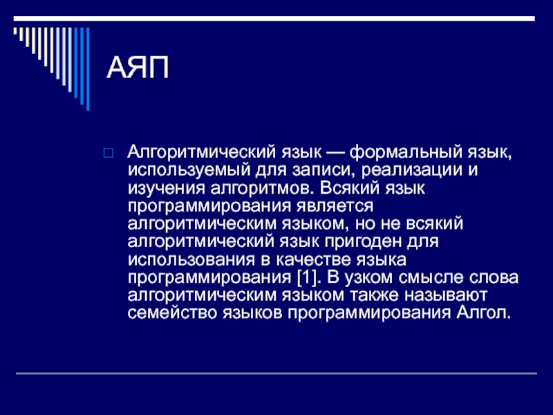 Алгоритмический язык — формальный язык, используемый для записи, реализации и