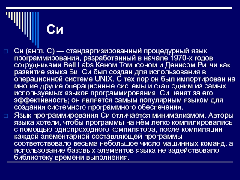 Денисом Ритчи как развитие языка Би. Си был создан для использования в операционной системе UNIX. С тех пор он был импортирован на многие другие операционные системы и стал одним из самых используемых языков программирования. Си ценят за его эффективность; он является самым популярным языком для создания системного программного обеспечения.