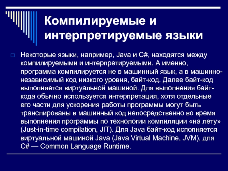 в машинный язык, а в машинно-независимый код низкого уровня, байт-код. Далее байт-код выполняется виртуальной машиной. Для выполнения байт-кода обычно используется интерпретация, хотя отдельные его части для ускорения работы программы могут быть транслированы в машинный код непосредственно во время выполнения программы по технологии компиляции «на лету» (Just-in-time compilation, JIT). Для Java байт-код исполняется виртуальной машиной Java (Java Virtual Machine, JVM), для C# — Common Language Runtime.