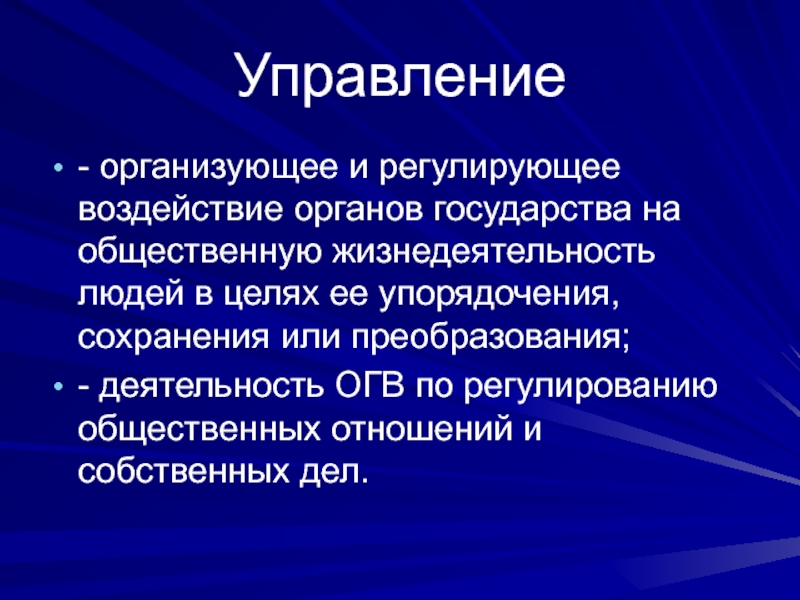 целенаправленное воздействие субъекта управления на общественные процессы, общественные отношения в соответствии с возложенными на него общественно-значимыми функциями.