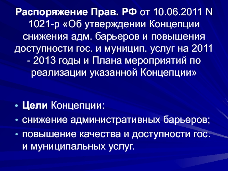 Слайд 34Распоряжение Прав. РФ от 10.06.2011 N 1021-р «Об утверждении Концепции