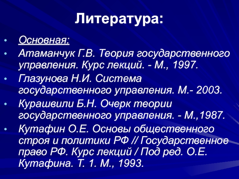 Атаманчук Г.В. Теория государственного управления. Курс лекций. - М., 1997.