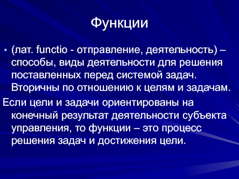 Если цели и задачи ориентированы на конечный результат деятельности субъекта управления, то функции – это процесс решения задач и достижения цели.