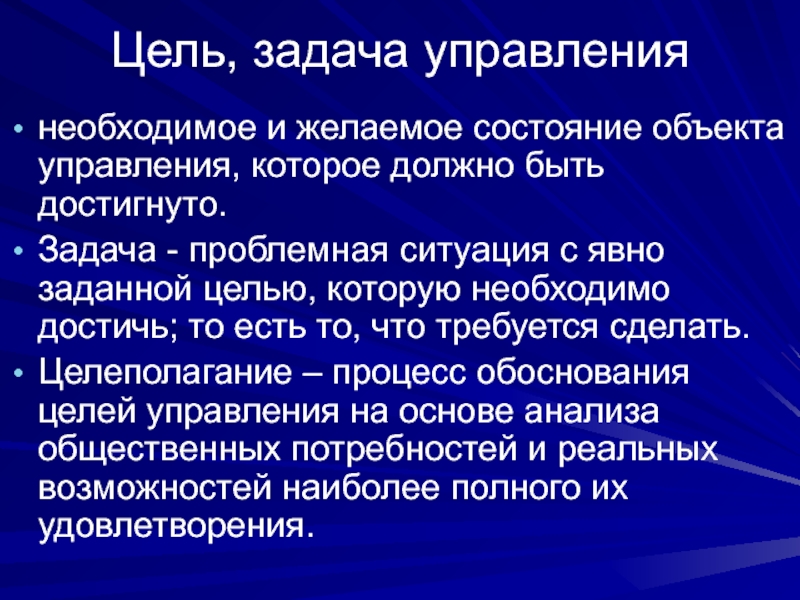 Целеполагание – процесс обоснования целей управления на основе анализа общественных потребностей и реальных возможностей наиболее полного их удовлетворения.