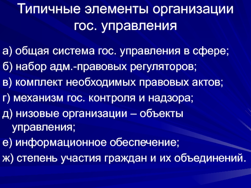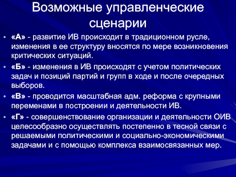 «Г» - совершенствование организации и деятельности ОИВ целесообразно осуществлять постепенно в тесной связи с решаемыми политическими и социально-экономическими задачами и с помощью комплекса взаимосвязанных мер.