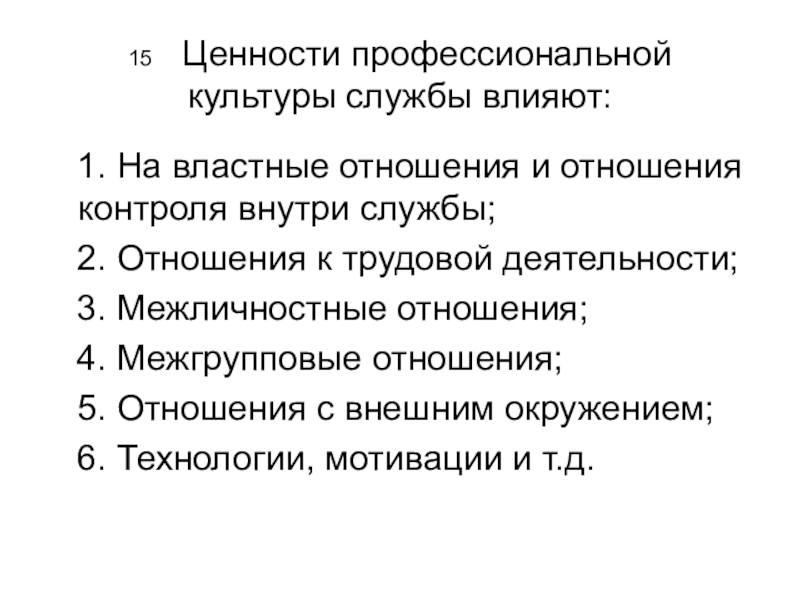 Слайд 1515 Ценности профессиональной культуры службы влияют: