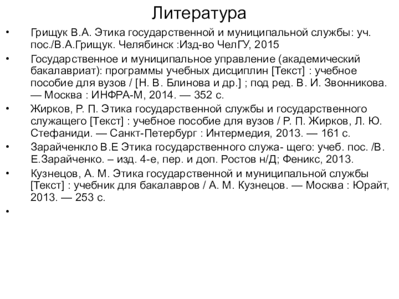 Жирков, Р. П. Этика государственной службы и государственного служащего [Текст] : учебное пособие для вузов / Р. П. Жирков, Л. Ю. Стефаниди. — Санкт-Петербург : Интермедия, 2013. — 161 с.