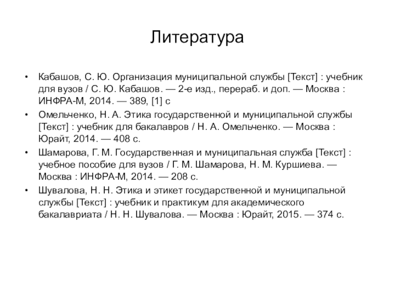 Шамарова, Г. М. Государственная и муниципальная служба [Текст] : учебное пособие для вузов / Г. М. Шамарова, Н. М. Куршиева. — Москва : ИНФРА-М, 2014. — 208 с.