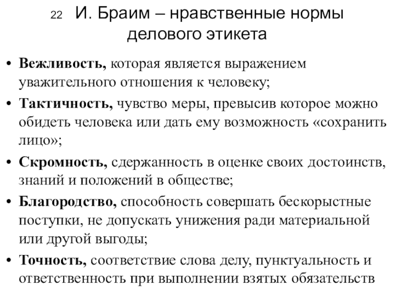 Слайд 2222 И. Браим – нравственные нормы делового этикета
