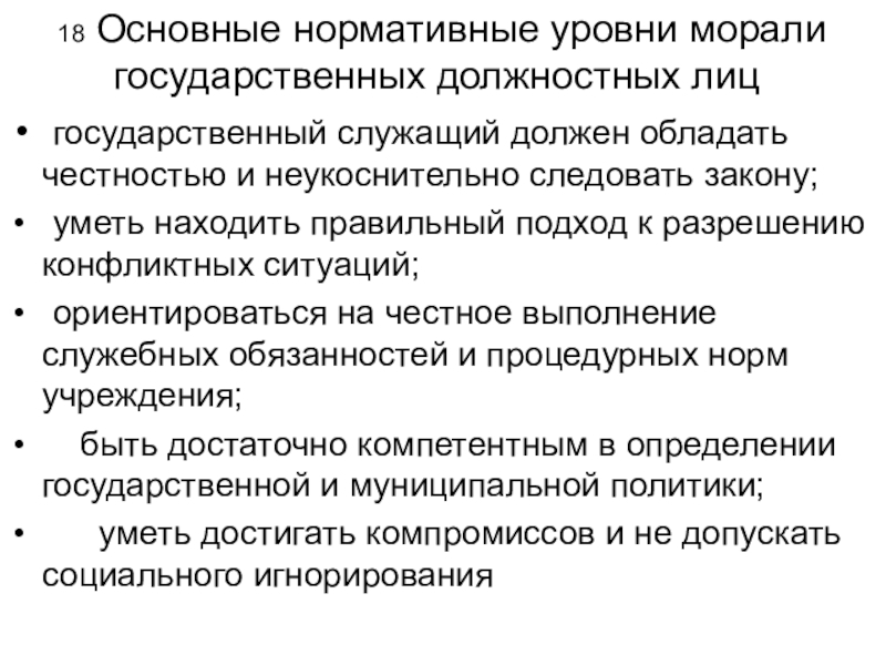 Слайд 18 18 Основные нормативные уровни морали государственных должностных лиц