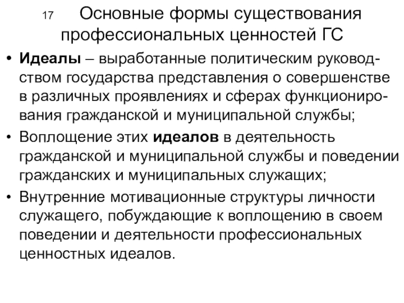 Слайд 1717 Основные формы существования профессиональных ценностей ГС