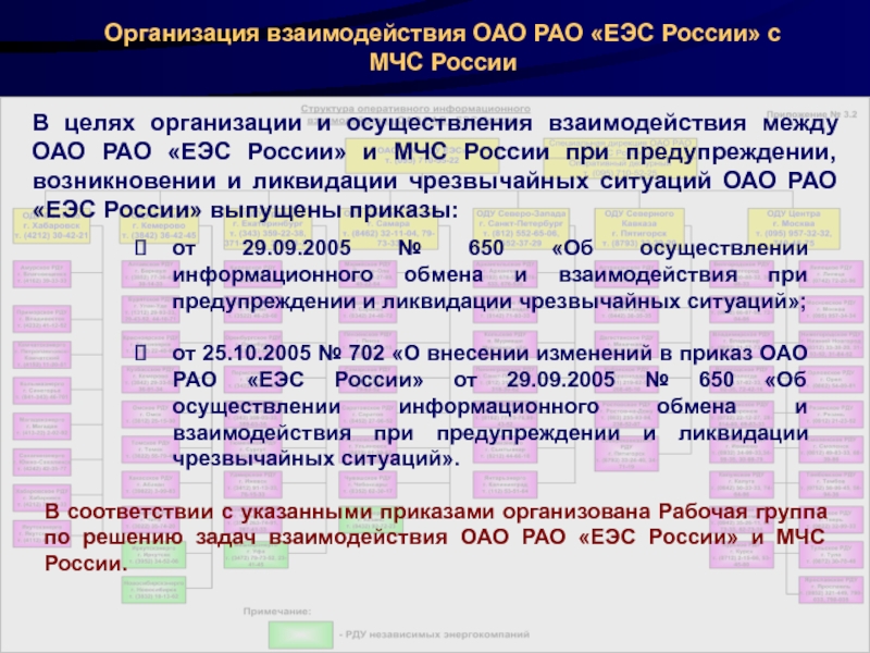 В соответствии с указанными приказами организована Рабочая группа по решению задач взаимодействия ОАО РАО «ЕЭС России» и МЧС России.