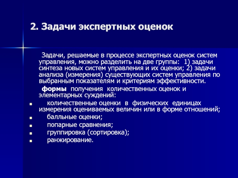 2. Задачи экспертных оценок	Задачи, решаемые в процессе экспертных оценок систем управления, можно разделить на две группы: 1)