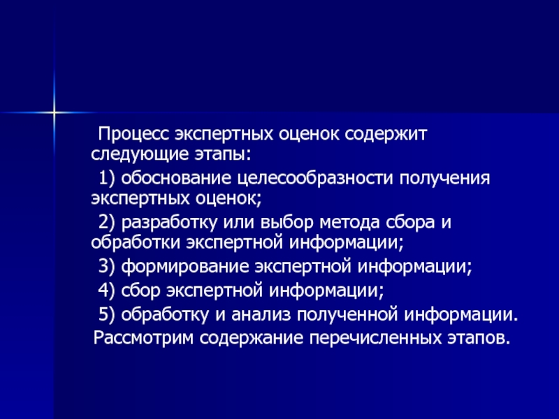 Процесс экспертных оценок содержит следующие этапы:	1) обоснование целесообразности получения экспертных оценок;	2) разработку или выбор метода сбора