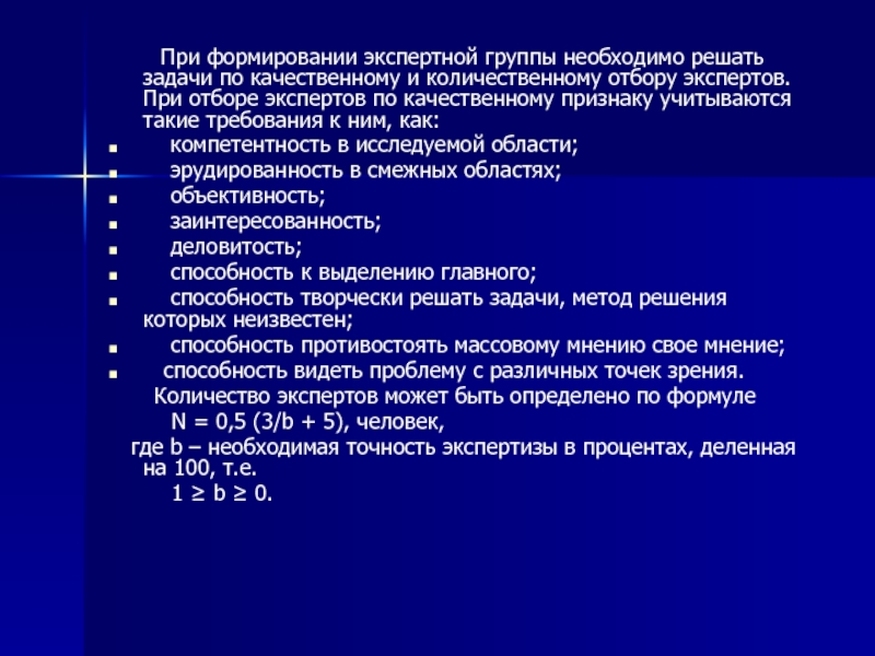 При формировании экспертной группы необходимо решать задачи по качественному и количественному отбору экспертов. При отборе экспертов